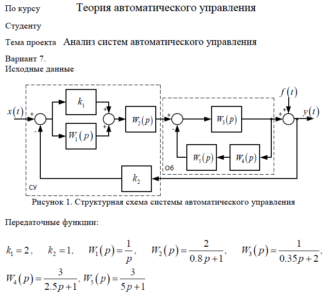 Показать/скрыть дополнительное описаниеАнализ и синтез системы автоматического управления. Привести исходную структурную схему к типовой одноконтурной системе автоматического управления. По полученной передаточной функции объекта управления записать: линейное дифференциальное уравнение объекта управления и привести его к стандартной форме записи; получить описание объекта управления через нули полюса и коэффициенты усиления системы; получить описание объекта управления в форме матрицы пространства состояния. Найти передаточную функцию системы по задающему и возмущающему воздействию. Записать уравнение динамики АСУ. Исследовать объект управления на устойчивость алгебраическими и частотными методами, определить запас устойчивости.