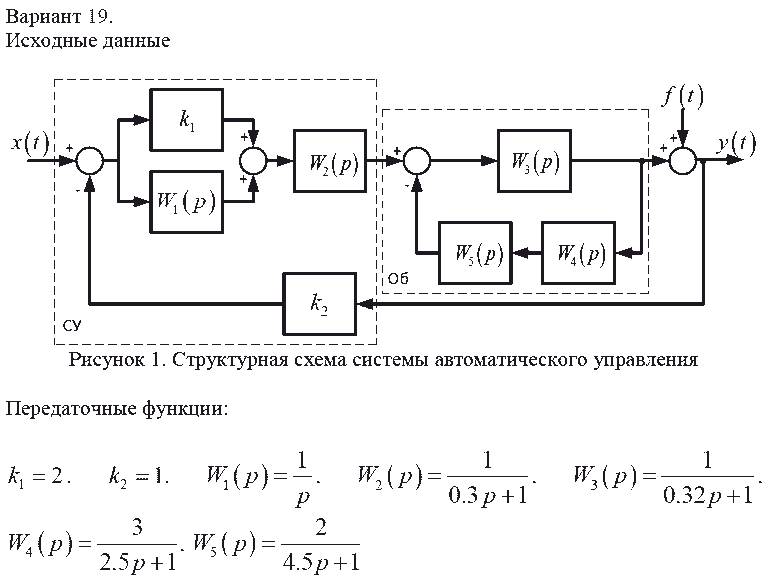 Показать/скрыть дополнительное описаниеАнализ и синтез системы автоматического управления. Привести исходную структурную схему к типовой одноконтурной системе автоматического управления. По полученной передаточной функции объекта управления записать: линейное дифференциальное уравнение объекта управления и привести его к стандартной форме записи; получить описание объекта управления через нули полюса и коэффициенты усиления системы; получить описание объекта управления в форме матрицы пространства состояния. Найти передаточную функцию системы по задающему и возмущающему воздействию. Записать уравнение динамики АСУ. Исследовать объект управления на устойчивость алгебраическими и частотными методами, определить запас устойчивости.