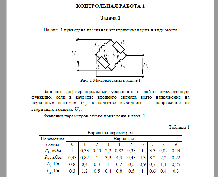 Показать/скрыть дополнительное описаниеУГЛТУ; Передаточные функции. Устойчивость и переходные процессы в системах автоматического регулирования. Курсовое проектирование.Пассивная электрическая цепь в виде моста.Записать дифференциальные уравнения и найти передаточную функцию. Найти передаточную функцию разомкнутой системы. Найти передаточную функцию замкнутой системы по задающему воздействию Х(р). Апериодическое звено 2-го порядка описывается передаточной функцией. Построить амплитудно-фазовую (АФХ) (комплексно-частотную (КЧХ)), амплитудно-частотную (АЧХ). фазочастотную (ФЧХ) и асимптотическую логарифмическую амплитудно-частотную (ЛАЧХ) характеристики звена. Представить ОР в виде структурной схемы и определить передаточные функции по каналам управления Wx (р) и возмущения Рассчитать и построить кривую переходного процесса y(t) в ОР а отсутствие автоматического регулятора (АР), если возмущение имеет вид неединичного скачка заданной величины; Составить структурную схему системы автоматического регулирования (САР) и найти передаточную функцию замкнутой САР по каналу возмущения; Рассчитать и построить кривую переходного процесса у(0 в системе с АР при скачкообразном изменении возмущения на величину; Оценить влияние АР на изменение времени переходного процесса в ОР: Сделать соответствующие выводы.