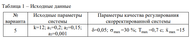 В качестве исходных данных проекта (таблица 1) заданы значения желаемой относительной статической ошибки δ, перерегулирование max , время переходного процесса Tmax , максимальное ускорение регулируемой величины max  x  при определенном начальном рассогласовании 0 g (принимается равным 1).