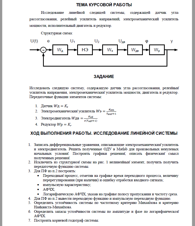 Показать/скрыть дополнительное описаниеКурсовая работа; РУДН; Исследование линейной стационарной системы управления 1. Записать дифференциальные уравнения, описывающие электромеханический усилитель и электродвигатель. Решить полученные ОДУ в Matlab для произвольных ненулевых начальных условий. Построить графики решений, описать физический смысл полученных решений. 2. Исключить из структурной схемы на рис. 1 нелинейный элемент, получить получить передаточную функцию системы. 3. Для ПФ из п.2 построить: - Переходный процесс, отметив на графике время переходного процесса, величину перерегулирования (при наличии) и ошибку отработки входного сигнала; - импульсную характеристику; - АФЧХ; - Логарифмическую АФЧХ, указав на графике полосу пропускания и частоту среза.