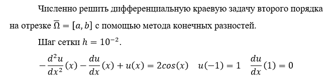 Численно решить дифференциальную краевую задачу второго порядка на отрезке с помощью метода конечных разностей.