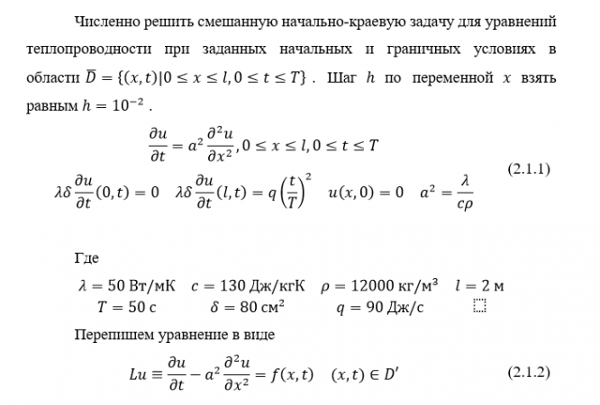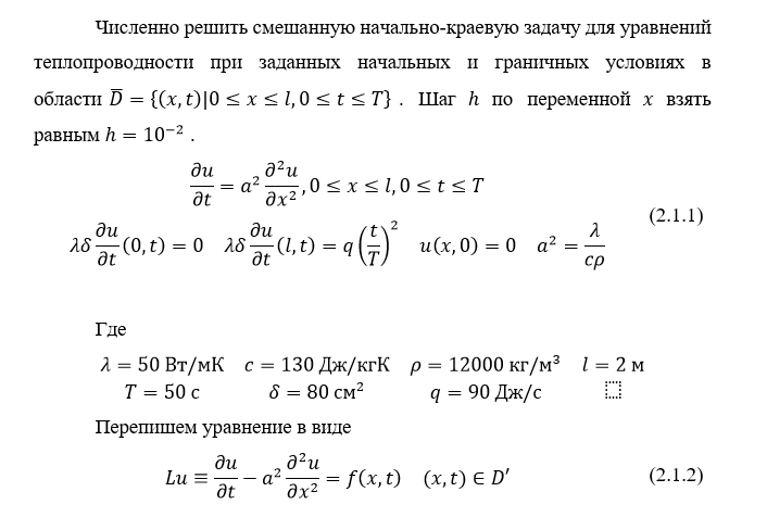 Численно решить смешанную начально-краевую задачу для уравнений теплопроводности при заданных начальных и граничных условиях в области . Шаг по переменной взять равным .