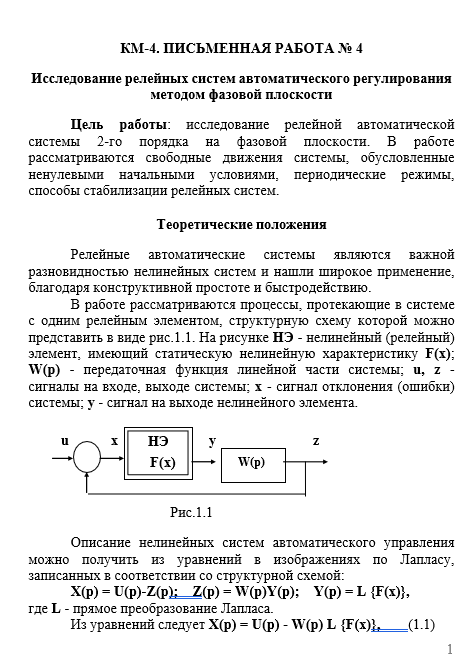 Для студентов ИДДО НИУ «МЭИ» по предмету Теория автоматического управления (ТАУ)КМ-4. Исследование релейных систем автоматического регулирования методом фазовой плоскости. Решение задач. Вариант 12КМ-4. Исследование релейных систем автоматического регулирования методом фазовой плоскости. Решение задач. Вариант 12