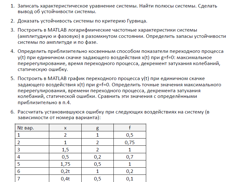 Показать/скрыть дополнительное описаниеУрФУ им. Ельцина, Основы теории автоматического управления. Контрольная работа. Часть 2. 1. Записать характеристическое уравнение системы. Найти полюсы системы. Сделать вывод об устойчивости системы. 2. Доказать устойчивость системы по критерию Гурвица. 3. Построить в MATLAB логарифмические частотные характеристики системы (амплитудную и фазовую) в разомкнутом состоянии. Определить запасы устойчивости системы по амплитуде и по фазе. 4. Определить приблизительно косвенным способом показатели переходного процесса y(t) при единичном скачке задающего воздействия x(t) при g=f=0: максимальное перерегулирование, время переходного процесса, декремент затухания колебаний, статическую ошибку.
