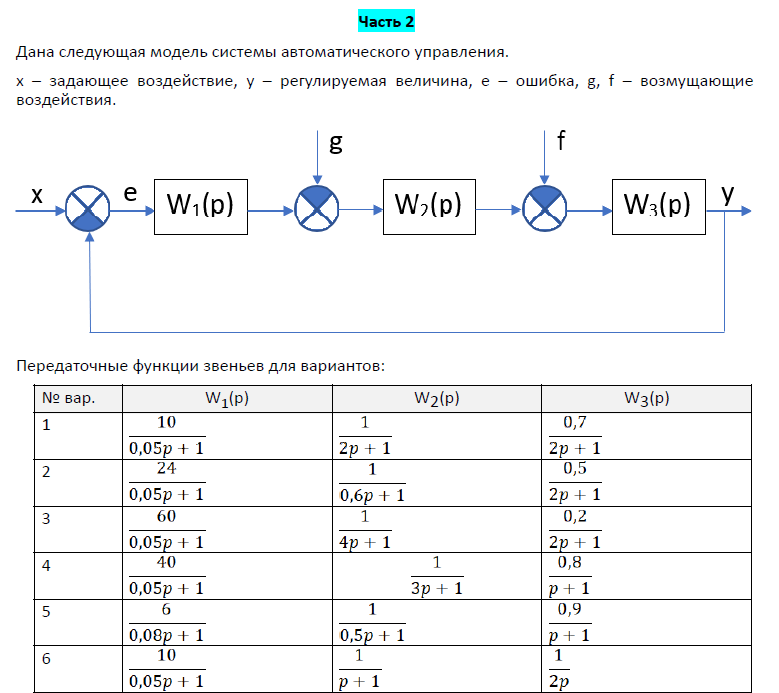 x – задающее воздействие, y – регулируемая величина, e – ошибка, g, f – возмущающие воздействия.