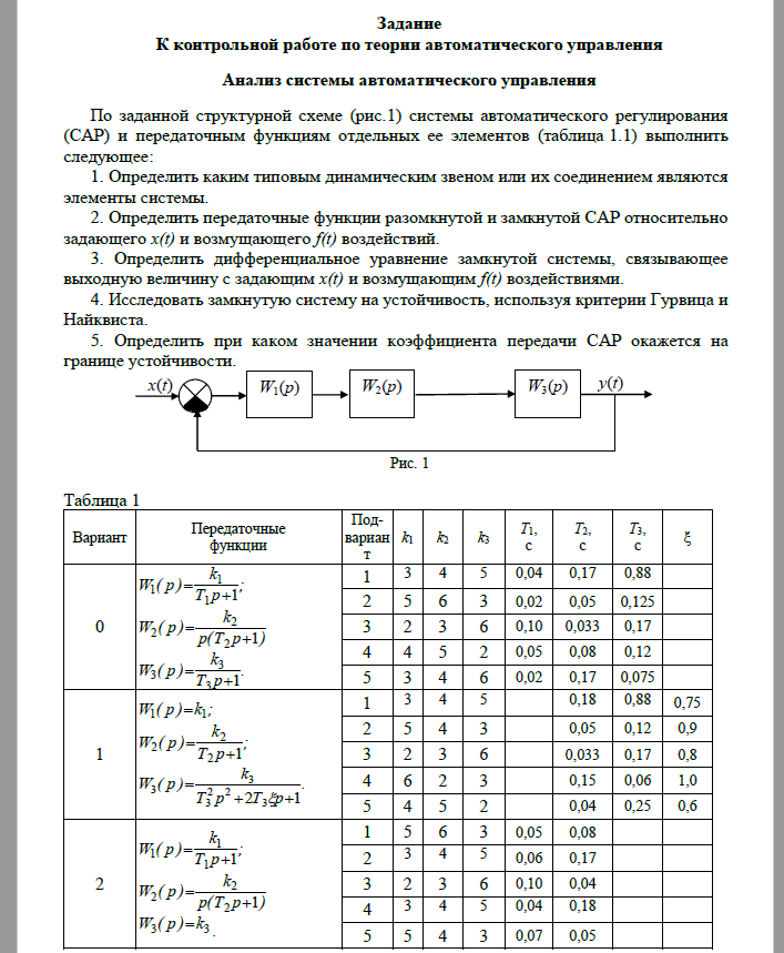 Показать/скрыть дополнительное описаниеДИТИ НИЯУ МИФИ; Анализ системы автоматического управленияПо заданной структурной схеме (рис.1) системы автоматического регулирования (САР) и передаточным функциям отдельных ее элементов (таблица 1.1) выполнить следующее: 1. Определить каким типовым динамическим звеном или их соединением являются элементы системы. 2. Определить передаточные функции разомкнутой и замкнутой САР относительно задающего х(t) и возмущающего f(t) воздействий. 3. Определить дифференциальное уравнение замкнутой системы, связывающее выходную величину с задающим х(t) и возмущающим f(t) воздействиями. 4. Исследовать замкнутую систему на устойчивость, используя критерии Гурвица и Найквиста.