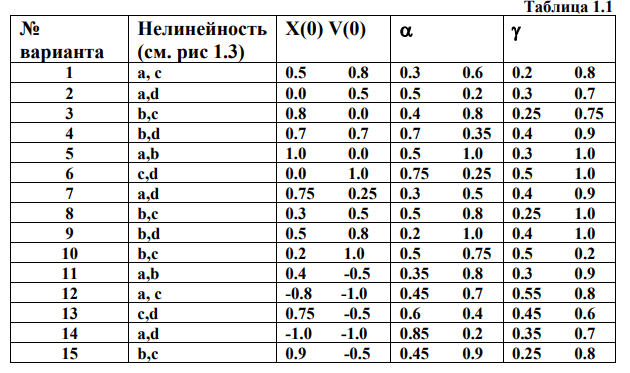 1. Для нелинейных характеристик и начальных значений, заданных в табл. 1.1 в соответствии с номером варианта, нарисовать вид фазовых траекторий для процессов в замкнутых системах рис.1.1 (без коррекции), рис.1,6 (с коррекцией по скорости), рис. 1.7 (с коррекцией жесткой обратной связью). Принять B=0,25; с=0,1; d=0,2.