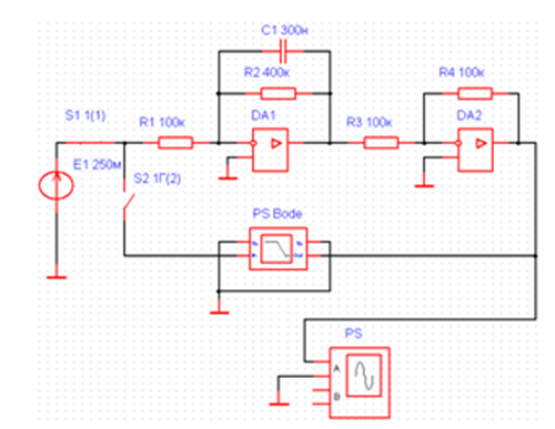 3.1 Собрать схему модели звена второго порядка. Приняв === =100 кОм, ==1 мкФ, ξ=0,7 и выбрав значения постоянной времени T (120 мс) и коэффициента передачи k (4) согласно индивидуальному варианту, рассчитать значения остальных параметров модели по формулам: