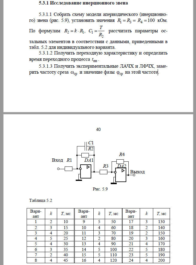 5.3.1.1 Собрать схему модели апериодического (инерционного) звена (рис. 5.9), установить значения R1 = R3 = R4 =100 кОм. По формулам рассчитать параметры остальных элементов в соответствии с данными, приведенными в табл. 5.2 для индивидуального варианта.