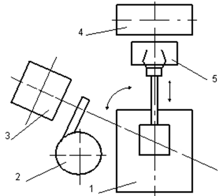 Студенческому конструкторскому бюро ВлГУ была поставлена задача разработать РТК горячей высадки болтов для Владимирского тракторного завода. В традиционном РТК (рис. 3) промышленный робот 1 берет заготовку из подающего устройства 2 и устанавливает ее в индуктор 3, где нагревается один ее конец. Затем промышленный робот переносит заготовку в штамп 4 и устанавливает ее в матрицу. После высадки головки болта промышленный робот захватывает готовую деталь, вынимает ее из матрицы, переносит и опускает в тару 5 для деталей.