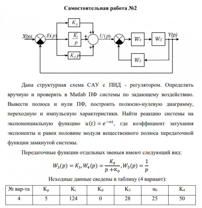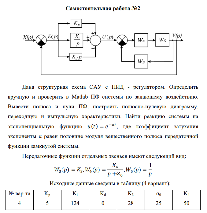 Дана структурная схема САУ с ПИД - регулятором. Определить вручную и проверить в Matlab ПФ системы по задающему воздействию. Вывести полюса и нули ПФ, построить полюсно-нулевую диаграмму, переходную и импульсную характеристики. Найти реакцию системы на экспоненциальную функцию, где коэффициент затухания экспоненты равен половине модуля вещественного полюса передаточной функции замкнутой системы. Передаточные функции отдельных звеньев имеют следующий вид: