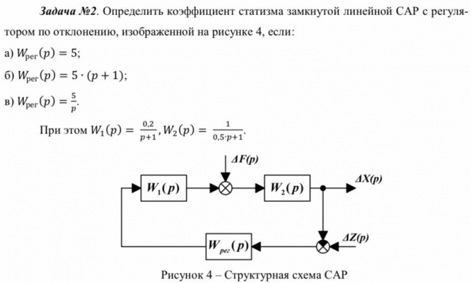 Для студентов ИГЭУ им. Ленина по предмету Теория автоматического управления (ТАУ)Определить коэффициент статизма замкнутой линейной САР с регулятором по отклонению, изображенной на рисунке 4, если: a) Wper (p) = 5; б) Wper(p) = 5*(Определить коэффициент статизма замкнутой линейной САР с регулятором по отклонению, изображенной на рисунке 4, если: a) Wper (p) = 5; б) Wper(p) = 5*(