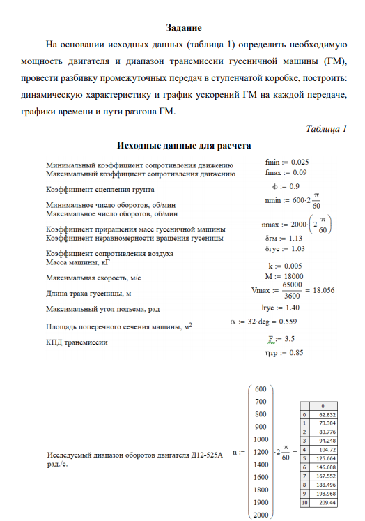 На основании исходных данных (таблица 1) определить необходимую мощность двигателя и диапазон трансмиссии гусеничной машины (ГМ), провести разбивку промежуточных передач в ступенчатой коробке, построить: динамическую характеристику и график ускорений ГМ на каждой передаче, графики времени и пути разгона ГМ.