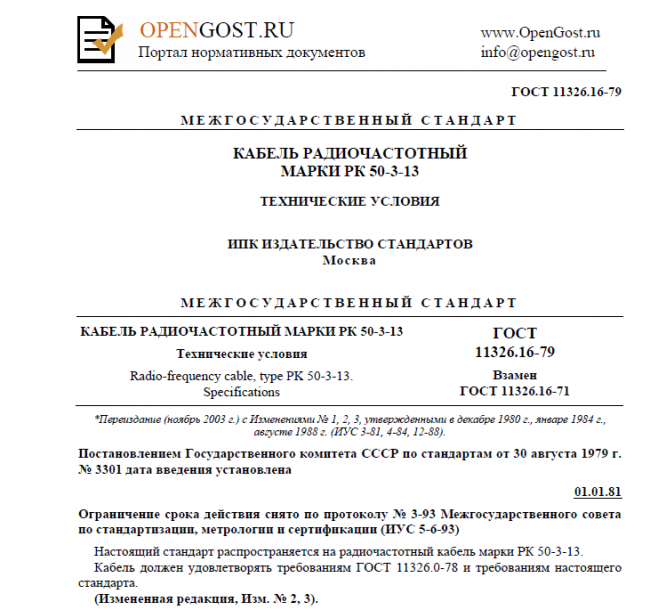 Стандарт: ГОСТ 11326.16-79 Кабель радиочастотный марки РК 50-3-13. Технические условия
