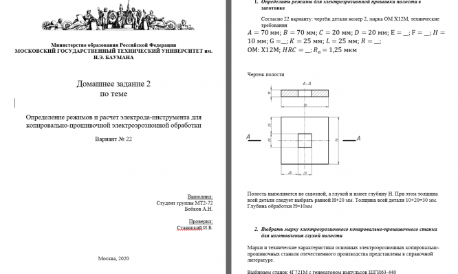 Для студентов МГТУ им. Н.Э.Баумана по предмету Теория физико-химических методов обработкиДЗ2 Определение режимов и расчет электрода-инструмента для копировально-прошивочной электроэрозионной обработки Вариант № 22ДЗ2 Определение режимов и расчет электрода-инструмента для копировально-прошивочной электроэрозионной обработки Вариант № 22