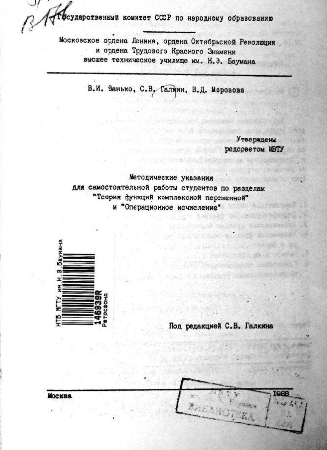 Главная » Учебные материалы » Теория функций комплексного переменного (ТФКП) » Книги » МГТУ им. Н.Э.Баумана » 4 семестр » В.И. Ванько, С.В. Галкин, В.Д. Морозова -Методические указания для самостоятельной работы студентов по разделам "Теория функций комплексной переменной" и "Операциооное исчисление"