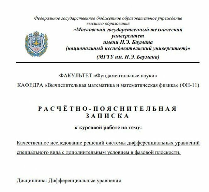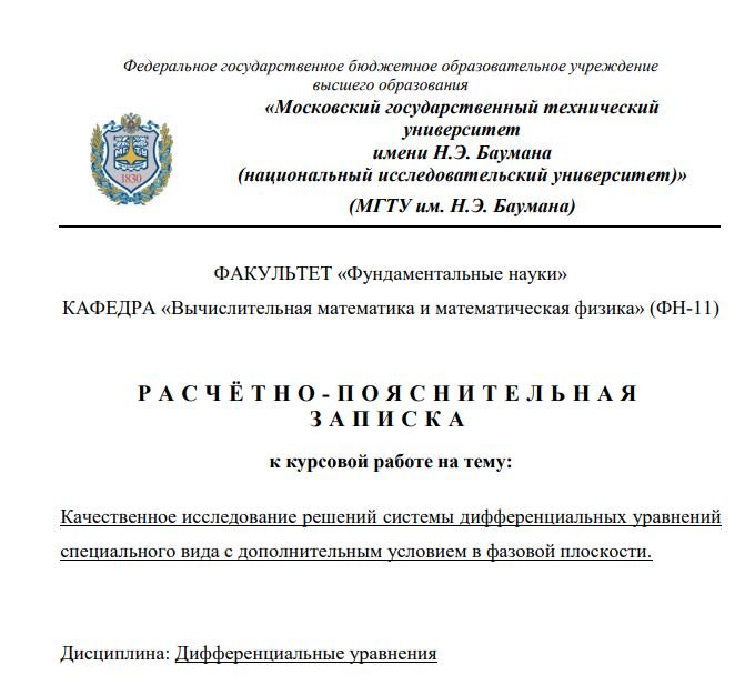 Главная » Учебные материалы » Теория функций комплексного переменного (ТФКП) » Курсовые работы » МГТУ им. Н.Э.Баумана » 4 семестр » Качественное исследование решений системы дифференциальных уравнений специального вида с дополнительным условием в фазовой плоскости