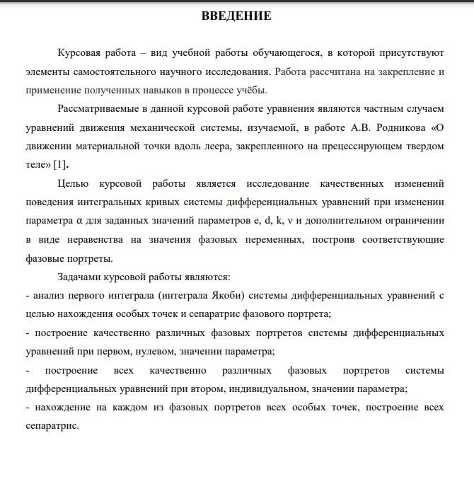 Цель работы – исследование качественных изменений поведения интегральных кривых системы дифференциальных уравнений при изменении параметра для заданных значений параметров e, d, k, и дополнительном ограничении в виде неравенства на значения фазовых переменных, построив соответствующие фазовые портреты. В результате работы была произведена устная защита курсовой работы, а также выполнен письменный отчет в соответствии со стандартами оформления научнотехнической документации.