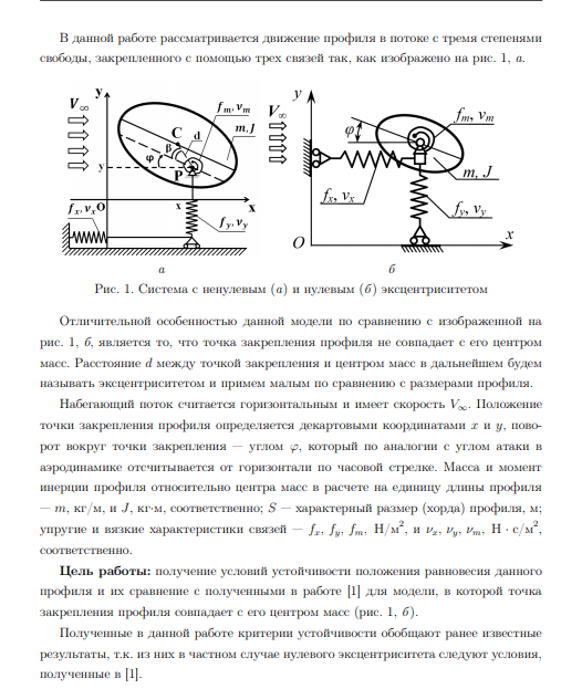Цель работы: получение условий устойчивости положения равновесия данного профиля и их сравнение с полученными в работе [1] для модели, в которой точка закрепления профиля совпадает с его центром масс (рис. 1, б ). Полученные в данной работе критерии устойчивости обобщают ранее известные результаты, т.к. из них в частном случае нулевого эксцентриситета следуют условия, полученные в [1].