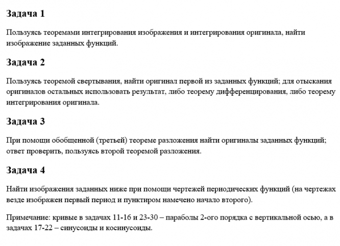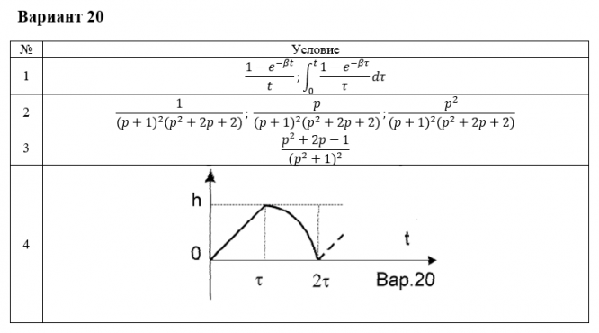 Задача 1 Пользуясь теоремами интегрирования изображения и интегрирования оригинала, найти изображение заданных функций. Задача 2 Пользуясь теоремой свертывания, найти оригинал первой из заданных функций; для отыскания оригиналов остальных использовать результат, либо теорему дифференцирования, либо теорему интегрирования оригинала. Задача 3 При помощи обобщенной (третьей) теореме разложения найти оригиналы заданных функций; ответ проверить, пользуясь второй теоремой разложения. Задача 4 Найти изображения заданных ниже при помощи чертежей периодических функций (на чертежах везде изображен первый период и пунктиром намечено начало второго). Примечание: кривые в задачах 11-16 и 23-30 – параболы 2-ого порядка с вертикальной осью, а в задачах 17-22 – синусоиды и косинусоиды.  Вариант 20 №Условие 1(1-e^(-βt))/t;∫_0^t▒〖(1-e^(-βτ))/τ dτ〗 21/(〖(p+1)〗^2 (p^2+2p+2)); p/(〖(p+1)〗^2 (p^2+2p+2));p^2/(〖(p+1)〗^2 (p^2+2p+2)) 3(p^2+2p-1)/(p^2+1)^2 4     .