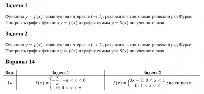 Задача 1 Функцию y=f(x), заданную на интервале (-l,l), разложить в тригонометрический ряд Фурье. Построить график функции y=f(x) и график суммы y=S(x) полученного ряда. Задача 2 Функцию y=f(x), заданную на интервале (-l,l), разложить в тригонометрический ряд Фурье. Построить график функции y=f(x) и график суммы y=S(x) полученного ряда. Вариант 14 Вар.Задача 1Задача 2 14f(x)={█(-x/π; -π<x<0@0; 0<x<π)┤f(x)={█(3x-3; 0<x<1@0; 1<x<3)┤ ;по синусам .