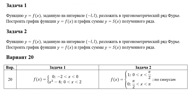 Задача 1 Функцию y=f(x), заданную на интервале (-l,l), разложить в тригонометрический ряд Фурье. Построить график функции y=f(x) и график суммы y=S(x) полученного ряда. Задача 2 Функцию y=f(x), заданную на интервале (-l,l), разложить в тригонометрический ряд Фурье. Построить график функции y=f(x) и график суммы y=S(x) полученного ряда. Вариант 20 Вар.Задача 1Задача 2 20f(x)={█(0; -2<x<0@x^2-4; 0<x<2)┤f(x)={█(1; 0<x<π/2@0; π/2<x<π)┤ ;по синусам .
