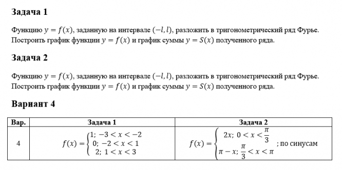 Задача 1 Функцию y=f(x), заданную на интервале (-l,l), разложить в тригонометрический ряд Фурье. Построить график функции y=f(x) и график суммы y=S(x) полученного ряда. Задача 2 Функцию y=f(x), заданную на интервале (-l,l), разложить в тригонометрический ряд Фурье. Построить график функции y=f(x) и график суммы y=S(x) полученного ряда. Вариант 4 Вар.Задача 1Задача 2 4f(x)={█(1; -3<x<-2@0; -2<x<1@2; 1<x<3)┤f(x)={█(2x; 0<x<π/3@π-x; π/3<x<π)┤ ;по синусам .