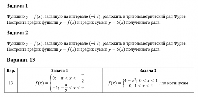Задача 1 Функцию y=f(x), заданную на интервале (-l,l), разложить в тригонометрический ряд Фурье. Построить график функции y=f(x) и график суммы y=S(x) полученного ряда. Задача 2 Функцию y=f(x), заданную на интервале (-l,l), разложить в тригонометрический ряд Фурье. Построить график функции y=f(x) и график суммы y=S(x) полученного ряда. Вариант 13 Вар.Задача 1Задача 2 13f(x)={█(0; -π<x<-π/2@-1; -π/2<x<π)┤f(x)={█(4-x^2; 0<x<1@0; 1<x<4)┤ ;по косинусам .