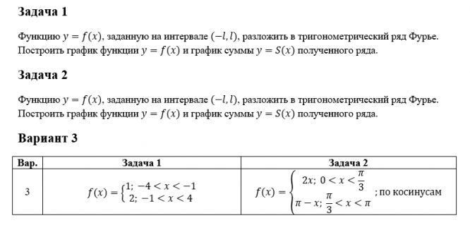 Задача 1 Функцию y=f(x), заданную на интервале (-l,l), разложить в тригонометрический ряд Фурье. Построить график функции y=f(x) и график суммы y=S(x) полученного ряда. Задача 2 Функцию y=f(x), заданную на интервале (-l,l), разложить в тригонометрический ряд Фурье. Построить график функции y=f(x) и график суммы y=S(x) полученного ряда. Вариант 3 Вар.Задача 1Задача 2 3f(x)={█(1; -4<x<-1@2; -1<x<4)┤f(x)={█(2x; 0<x<π/3@π-x; π/3<x<π)┤ ;по косинусам .