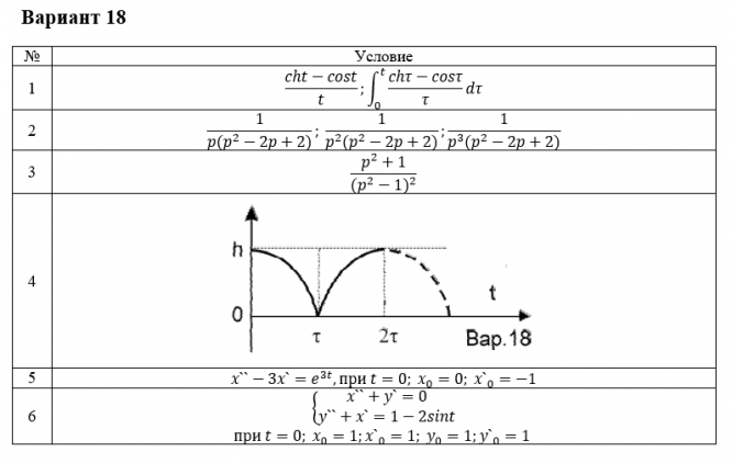 Примечание: кривые в задачах 11-16 и 23-30 – параболы 2-ого порядка с вертикальной осью, а в задачах 17-22 – синусоиды и косинусоиды. Задача 5 Проинтегрировать следующие линейные дифференциальные уравнения при заданных начальных условиях. Задача 6 Проинтегрировать следующие системы линейных дифференциальных уравнений при заданных начальных условиях. Вариант 18 №Условие 1(cht-cost)/t;∫_0^t▒〖(chτ-cosτ)/τ dτ〗 21/(p(p^2-2p+2)); 1/(p^2 (p^2-2p+2));1/(p^3 (p^2-2p+2)) 3(p^2+1)/(p^2-1)^2 4 5x``-3x`=e^3t,при t=0; x_0=0; 〖x`〗_0=-1 6{█(x``+y`=0@y``+x`=1-2sint)┤ при t=0; x_0=1;〖x`〗_0=1; y_0=1;〖y`〗_0=1 .