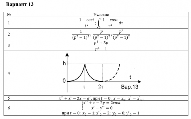 Примечание: кривые в задачах 11-16 и 23-30 – параболы 2-ого порядка с вертикальной осью, а в задачах 17-22 – синусоиды и косинусоиды. Задача 5 Проинтегрировать следующие линейные дифференциальные уравнения при заданных начальных условиях. Задача 6 Проинтегрировать следующие системы линейных дифференциальных уравнений при заданных начальных условиях. Вариант 13 №Условие 1(1-cost)/t^2 ;∫_0^t▒〖(1-cosτ)/τ^2 dτ〗 21/〖(p^2-1)〗^2 ; p/〖(p^2-1)〗^2 ;p^2/〖(p^2-1)〗^2 3(p^3+3p)/(p^4-1) 4 5x``+x`-2x=e^t,при t=0; x=x_0; x`=〖x`〗_0; 6{█(x``+x-2y=2cost@x`-y``=0)┤ при t=0; x_0=1;〖x`〗_0=2; y_0=0;〖y`〗_0=1.