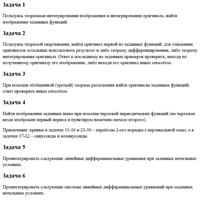 Задача 1 Пользуясь теоремами интегрирования изображения и интегрирования оригинала, найти изображение заданных функций. Задача 2 Пользуясь теоремой свертывания, найти оригинал первой из заданных функций; для отыскания оригиналов остальных использовать результат и либо теорему дифференцирования, либо теорему интегрирования оригинала. Ответ к последнему из заданных примеров проверить, находя по полученному оригиналу его изображение, либо находя его оригинал иным способом. Задача 3 При помощи обобщенной (третьей) теореме разложения найти оригиналы заданных функций; ответ проверить иным способом. Задача 4 Найти изображения заданных ниже при помощи чертежей периодических функций (на чертежах везде изображен первый период и пунктиром намечено начало второго).