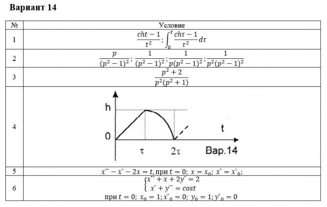 Примечание: кривые в задачах 11-16 и 23-30 – параболы 2-ого порядка с вертикальной осью, а в задачах 17-22 – синусоиды и косинусоиды. Задача 5 Проинтегрировать следующие линейные дифференциальные уравнения при заданных начальных условиях. Задача 6 Проинтегрировать следующие системы линейных дифференциальных уравнений при заданных начальных условиях.  Вариант 14 №Условие 1(cht-1)/t^2 ;∫_0^t▒〖(chτ-1)/τ^2 dτ〗 2p/〖(p^2-1)〗^2 ; 1/〖(p^2-1)〗^2 ;1/〖p(p^2-1)〗^2 ;1/〖p^2 (p^2-1)〗^2 3(p^2+2)/(p^2 (p^2+1)) 4 5x``-x`-2x=t,при t=0; x=x_0; x`=〖x`〗_0; 6{█(x``+x+2y`=2@x`+y``=cost)┤ при t=0; x_0=1;〖x`〗_0=0; y_0=1;〖y`〗_0=0  .