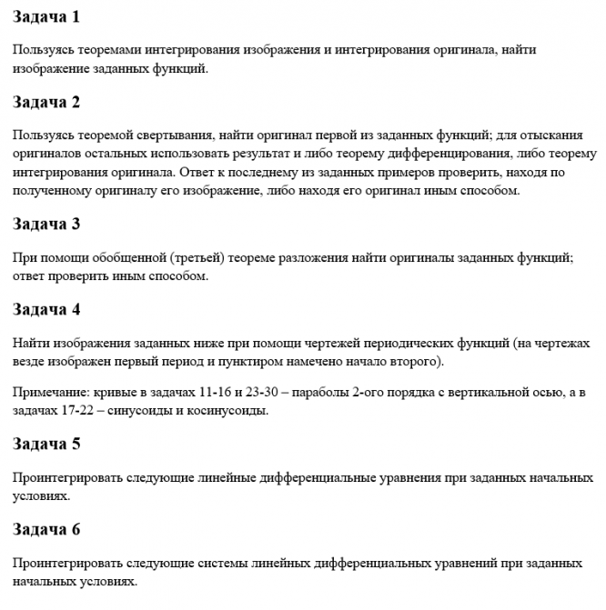 Задача 1 Пользуясь теоремами интегрирования изображения и интегрирования оригинала, найти изображение заданных функций. Задача 2 Пользуясь теоремой свертывания, найти оригинал первой из заданных функций; для отыскания оригиналов остальных использовать результат и либо теорему дифференцирования, либо теорему интегрирования оригинала. Ответ к последнему из заданных примеров проверить, находя по полученному оригиналу его изображение, либо находя его оригинал иным способом. Задача 3 При помощи обобщенной (третьей) теореме разложения найти оригиналы заданных функций; ответ проверить иным способом. Задача 4 Найти изображения заданных ниже при помощи чертежей периодических функций (на чертежах везде изображен первый период и пунктиром намечено начало второго).