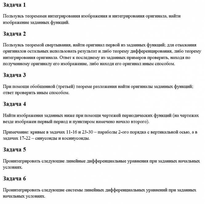 Задача 1 Пользуясь теоремами интегрирования изображения и интегрирования оригинала, найти изображение заданных функций. Задача 2 Пользуясь теоремой свертывания, найти оригинал первой из заданных функций; для отыскания оригиналов остальных использовать результат и либо теорему дифференцирования, либо теорему интегрирования оригинала. Ответ к последнему из заданных примеров проверить, находя по полученному оригиналу его изображение, либо находя его оригинал иным способом. Задача 3 При помощи обобщенной (третьей) теореме разложения найти оригиналы заданных функций; ответ проверить иным способом. Задача 4 Найти изображения заданных ниже при помощи чертежей периодических функций (на чертежах везде изображен первый период и пунктиром намечено начало второго).