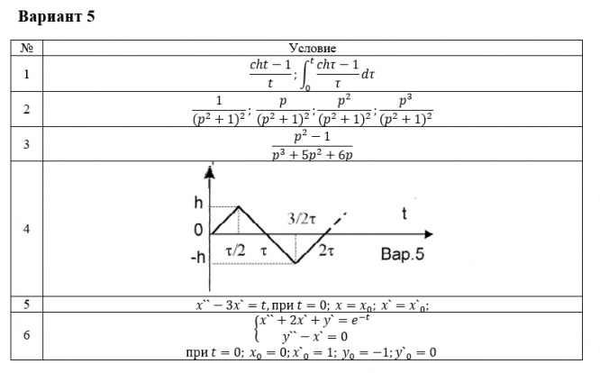 Примечание: кривые в задачах 11-16 и 23-30 – параболы 2-ого порядка с вертикальной осью, а в задачах 17-22 – синусоиды и косинусоиды. Задача 5 Проинтегрировать следующие линейные дифференциальные уравнения при заданных начальных условиях. Задача 6 Проинтегрировать следующие системы линейных дифференциальных уравнений при заданных начальных условиях. Вариант 5 №Условие 1(cht-1)/t;∫_0^t▒〖(chτ-1)/τ dτ〗 21/〖(p^2+1)〗^2 ; p/〖(p^2+1)〗^2 ;p^2/〖(p^2+1)〗^2 ;p^3/〖(p^2+1)〗^2 3(p^2-1)/(p^3+5p^2+6p) 4 5x``-3x`=t,при t=0; x=x_0; x`=〖x`〗_0; 6{█(x``+2x`+y`=e^(-t)@y``-x`=0)┤ при t=0; x_0=0;〖x`〗_0=1; y_0=-1;〖y`〗_0=0 .