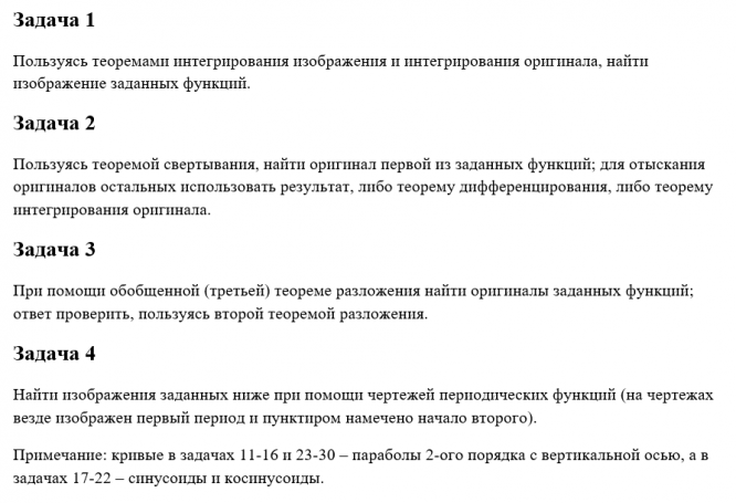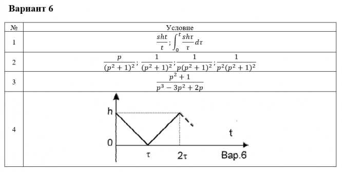 Задача 1 Пользуясь теоремами интегрирования изображения и интегрирования оригинала, найти изображение заданных функций. Задача 2 Пользуясь теоремой свертывания, найти оригинал первой из заданных функций; для отыскания оригиналов остальных использовать результат, либо теорему дифференцирования, либо теорему интегрирования оригинала. Задача 3 При помощи обобщенной (третьей) теореме разложения найти оригиналы заданных функций; ответ проверить, пользуясь второй теоремой разложения. Задача 4 Найти изображения заданных ниже при помощи чертежей периодических функций (на чертежах везде изображен первый период и пунктиром намечено начало второго). Примечание: кривые в задачах 11-16 и 23-30 – параболы 2-ого порядка с вертикальной осью, а в задачах 17-22 – синусоиды и косинусоиды. Вариант 6 №Условие 1sht/t;∫_0^t▒〖shτ/τ dτ〗 2p/〖(p^2+1)〗^2 ; 1/〖(p^2+1)〗^2 ;1/〖p(p^2+1)〗^2 ;1/(p^2 〖(p^2+1)〗^2 ) 3(p^2+1)/(p^3-3p^2+2p) 4 .