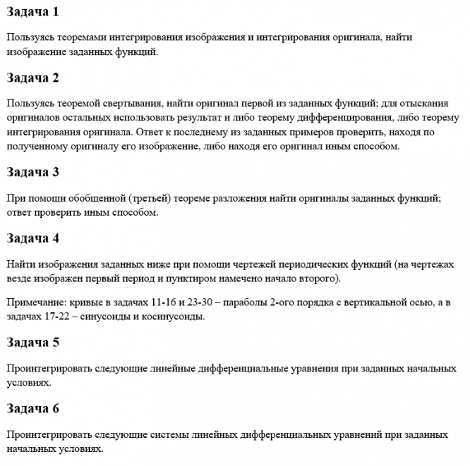 Задача 1 Пользуясь теоремами интегрирования изображения и интегрирования оригинала, найти изображение заданных функций. Задача 2 Пользуясь теоремой свертывания, найти оригинал первой из заданных функций; для отыскания оригиналов остальных использовать результат и либо теорему дифференцирования, либо теорему интегрирования оригинала. Ответ к последнему из заданных примеров проверить, находя по полученному оригиналу его изображение, либо находя его оригинал иным способом. Задача 3 При помощи обобщенной (третьей) теореме разложения найти оригиналы заданных функций; ответ проверить иным способом. Задача 4 Найти изображения заданных ниже при помощи чертежей периодических функций (на чертежах везде изображен первый период и пунктиром намечено начало второго).