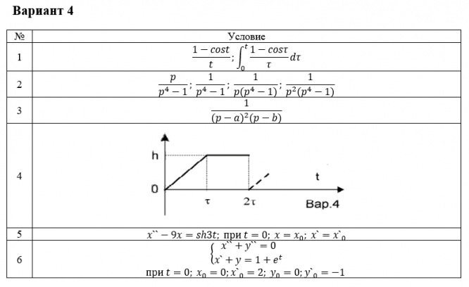 Примечание: кривые в задачах 11-16 и 23-30 – параболы 2-ого порядка с вертикальной осью, а в задачах 17-22 – синусоиды и косинусоиды. Задача 5 Проинтегрировать следующие линейные дифференциальные уравнения при заданных начальных условиях. Задача 6 Проинтегрировать следующие системы линейных дифференциальных уравнений при заданных начальных условиях. Вариант 4 №Условие 1(1-cost)/t;∫_0^t▒〖(1-cosτ)/τ dτ〗 2p/(p^4-1); 1/(p^4-1); 1/(p(p^4-1)); 1/(p^2 (p^4-1)) 31/(〖(p-a)〗^2 (p-b)) 4 5x``-9x=sh3t; при t=0; x=x_0; x`=〖x`〗_0 6{█(x``+y``=0@x`+y=1+e^t )┤ при t=0; x_0=0;〖x`〗_0=2; y_0=0;〖y`〗_0=-1 .