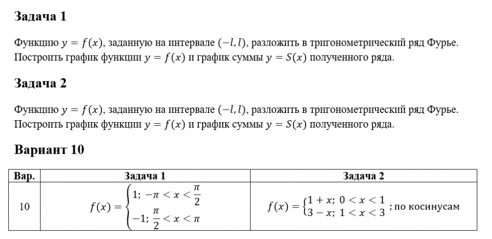 Задача 1 Функцию y=f(x), заданную на интервале (-l,l), разложить в тригонометрический ряд Фурье. Построить график функции y=f(x) и график суммы y=S(x) полученного ряда. Задача 2 Функцию y=f(x), заданную на интервале (-l,l), разложить в тригонометрический ряд Фурье. Построить график функции y=f(x) и график суммы y=S(x) полученного ряда. Вариант 10 Вар.Задача 1Задача 2 10f(x)={█(1; -π<x<π/2@-1; π/2<x<π)┤f(x)={█(1+x; 0<x<1@3-x; 1<x<3)┤ ;по косинусам .