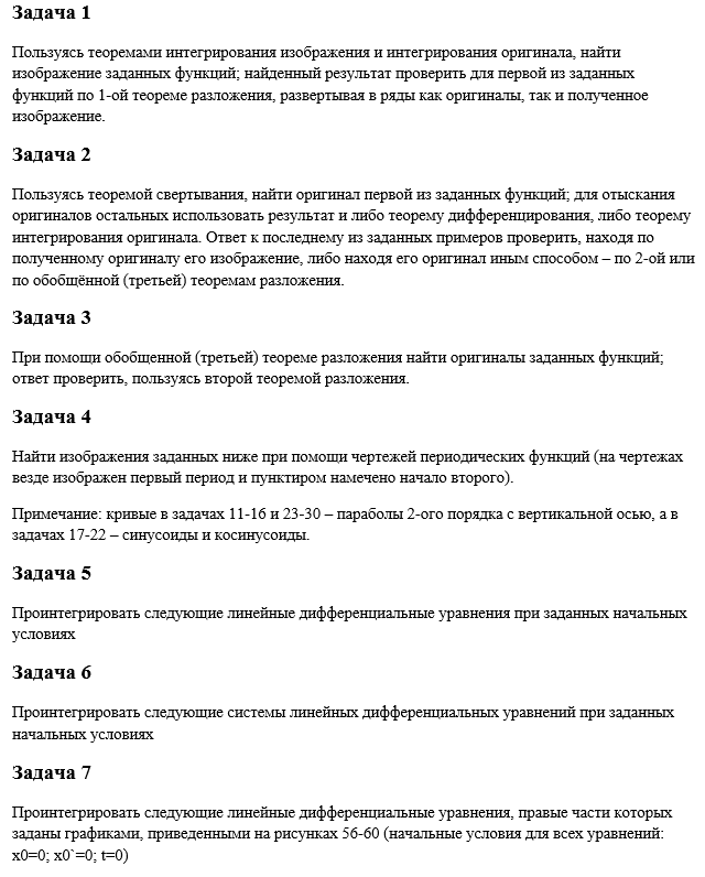 Задача 1 Пользуясь теоремами интегрирования изображения и интегрирования оригинала, найти изображение заданных функций; найденный результат проверить для первой из заданных функций по 1-ой теореме разложения, развертывая в ряды как оригиналы, так и полученное изображение. Задача 2 Пользуясь теоремой свертывания, найти оригинал первой из заданных функций; для отыскания оригиналов остальных использовать результат и либо теорему дифференцирования, либо теорему интегрирования оригинала. Ответ к последнему из заданных примеров проверить, находя по полученному оригиналу его изображение, либо находя его оригинал иным способом – по 2-ой или по обобщённой (третьей) теоремам разложения.