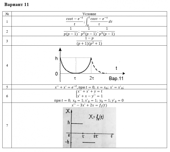 Задача 3 При помощи обобщенной (третьей) теореме разложения найти оригиналы заданных функций; ответ проверить, пользуясь второй теоремой разложения. Задача 4 Найти изображения заданных ниже при помощи чертежей периодических функций (на чертежах везде изображен первый период и пунктиром намечено начало второго). Примечание: кривые в задачах 11-16 и 23-30 – параболы 2-ого порядка с вертикальной осью, а в задачах 17-22 – синусоиды и косинусоиды. Задача 5 Проинтегрировать следующие линейные дифференциальные уравнения при заданных начальных условиях Задача 6 Проинтегрировать следующие системы линейных дифференциальных уравнений при заданных начальных условиях Задача 7 Проинтегрировать следующие линейные дифференциальные уравнения, правые части которых заданы графиками, приведенными на рисунках 56-60 (начальные условия для всех уравнений: x0=0; x0`=0; t=0)    Вариант 11 №Условие 1(cost-e^(-t))/t;∫_0^t▒〖(cosτ-e^(-τ))/τ dτ〗 21/(p(p-1)); 1/(p^2 (p-1));1/(p^3 (p-1)) 3(1-p)/((p+1)(p^2+1)) 4 5x``+x`=e^(-t),при t=0; x=x_0; x`=〖x`〗_0; 6{█(x``+x`+y=t@x`+x-y``=1)┤ при t=0; x_0=1;〖x`〗_0=1; y_0=1;〖y`〗_0=0 7x``-3x`+2x=f_2 (t).