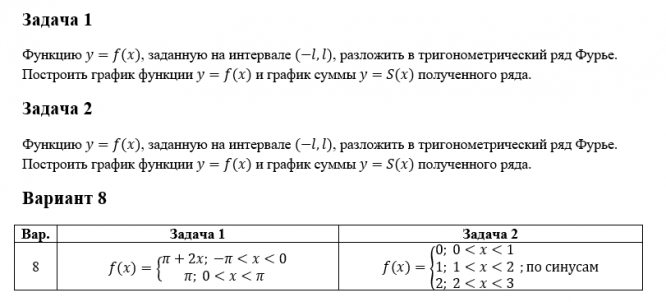 Задача 1 Функцию y=f(x), заданную на интервале (-l,l), разложить в тригонометрический ряд Фурье. Построить график функции y=f(x) и график суммы y=S(x) полученного ряда. Задача 2 Функцию y=f(x), заданную на интервале (-l,l), разложить в тригонометрический ряд Фурье. Построить график функции y=f(x) и график суммы y=S(x) полученного ряда. Вариант 8 Вар.Задача 1Задача 2 8f(x)={█(π+2x; -π<x<0@π; 0<x<π)┤f(x)={█(0; 0<x<1@1; 1<x<2@2; 2<x<3)┤ ;по синусам .