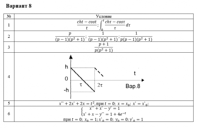 Примечание: кривые в задачах 11-16 и 23-30 – параболы 2-ого порядка с вертикальной осью, а в задачах 17-22 – синусоиды и косинусоиды. Задача 5 Проинтегрировать следующие линейные дифференциальные уравнения при заданных начальных условиях. Задача 6 Проинтегрировать следующие системы линейных дифференциальных уравнений при заданных начальных условиях. Вариант 8 № Условие 1 (cht-cost)/t;∫_0^t▒〖(chτ-cosτ)/τ dτ〗 2 p/((p-1)(p^2+1)); 1/((p-1)(p^2+1));1/(p(p-1)(p^2+1)) 3 (p+1)/(p(p^2+1)) 4 5 x``+2x`+2x=t^2,при t=0; x=x_0; x`=〖x`〗_0; 6 {█(x``+x`-y`=1@x`+x-y``=1+4e^(-t) )┤ при t=0; x_0=1;〖x`〗_0=0; y_0=0;〖y`〗_0=1 .