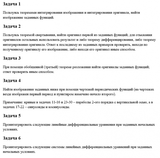 Задача 1 Пользуясь теоремами интегрирования изображения и интегрирования оригинала, найти изображение заданных функций. Задача 2 Пользуясь теоремой свертывания, найти оригинал первой из заданных функций; для отыскания оригиналов остальных использовать результат и либо теорему дифференцирования, либо теорему интегрирования оригинала. Ответ к последнему из заданных примеров проверить, находя по полученному оригиналу его изображение, либо находя его оригинал иным способом. Задача 3 При помощи обобщенной (третьей) теореме разложения найти оригиналы заданных функций; ответ проверить иным способом. Задача 4 Найти изображения заданных ниже при помощи чертежей периодических функций (на чертежах везде изображен первый период и пунктиром намечено начало второго).