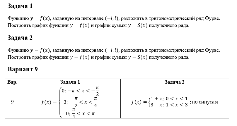 Задача 1 Функцию y=f(x), заданную на интервале (-l,l), разложить в тригонометрический ряд Фурье. Построить график функции y=f(x) и график суммы y=S(x) полученного ряда. Задача 2 Функцию y=f(x), заданную на интервале (-l,l), разложить в тригонометрический ряд Фурье. Построить график функции y=f(x) и график суммы y=S(x) полученного ряда. Вариант 9 Вар.Задача 1Задача 2 9f(x)={█(0; -π<x<-π/2@3; -π/2<x<π/4@0; π/4<x<π)┤f(x)={█(1+x; 0<x<1@3-x; 1<x<3)┤ ;по синусам.