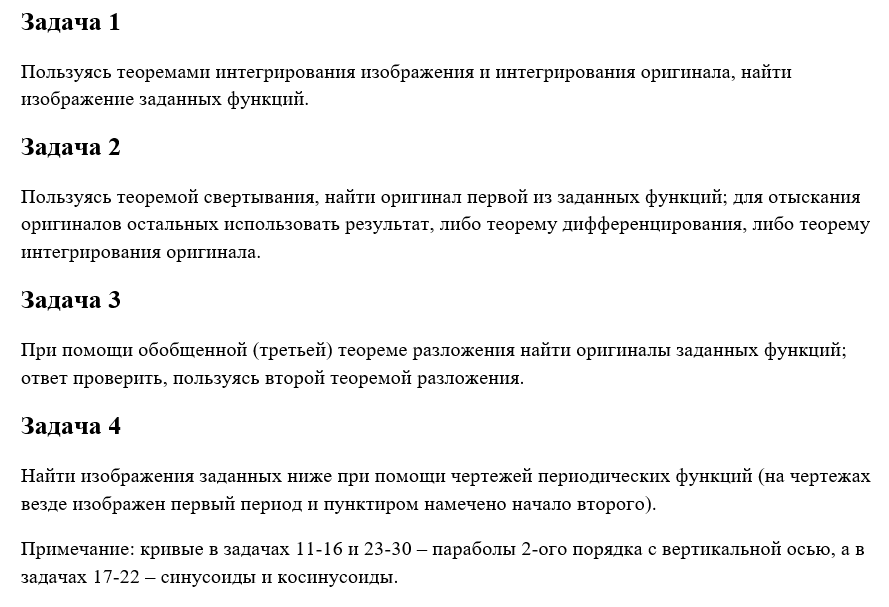 Задача 1 Пользуясь теоремами интегрирования изображения и интегрирования оригинала, найти изображение заданных функций. Задача 2 Пользуясь теоремой свертывания, найти оригинал первой из заданных функций; для отыскания оригиналов остальных использовать результат, либо теорему дифференцирования, либо теорему интегрирования оригинала. Задача 3 При помощи обобщенной (третьей) теореме разложения найти оригиналы заданных функций; ответ проверить, пользуясь второй теоремой разложения. Задача 4 Найти изображения заданных ниже при помощи чертежей периодических функций (на чертежах везде изображен первый период и пунктиром намечено начало второго). Примечание: кривые в задачах 11-16 и 23-30 – параболы 2-ого порядка с вертикальной осью, а в задачах 17-22 – синусоиды и косинусоиды.
