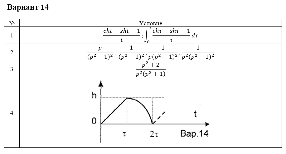 Вариант 14 №Условие 1(cht-sht-1)/t;∫_0^t▒〖(chτ-shτ-1)/τ dτ〗 2p/〖(p^2-1)〗^2 ; 1/〖(p^2-1)〗^2 ;1/〖p(p^2-1)〗^2 ;1/〖p^2 (p^2-1)〗^2 3(p^2+2)/(p^2 (p^2+1)) 4    .