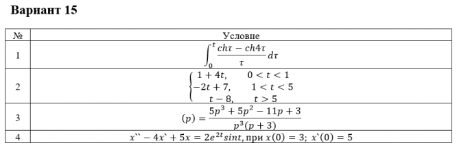 Задача 1 Найти изображение оригинала. Задача 2 Найти изображение оригинала. Задача 3 Найти оригинал изображения. Задача 4 Решить операционным методом задачу Коши для ДУ второго порядка  Вариант 15 №Условие 1∫_0^t▒〖(chτ-ch4τ)/τ dτ〗 2{█(1+4t,0<t<1@-2t+7,1<t<5@t-8,t>5)┤ 3(p)=(5p^3+5p^2-11p+3)/(p^3 (p+3)) 4x``-4x`+5x=2e^2t sint,при x(0)=3; x`(0)=5.